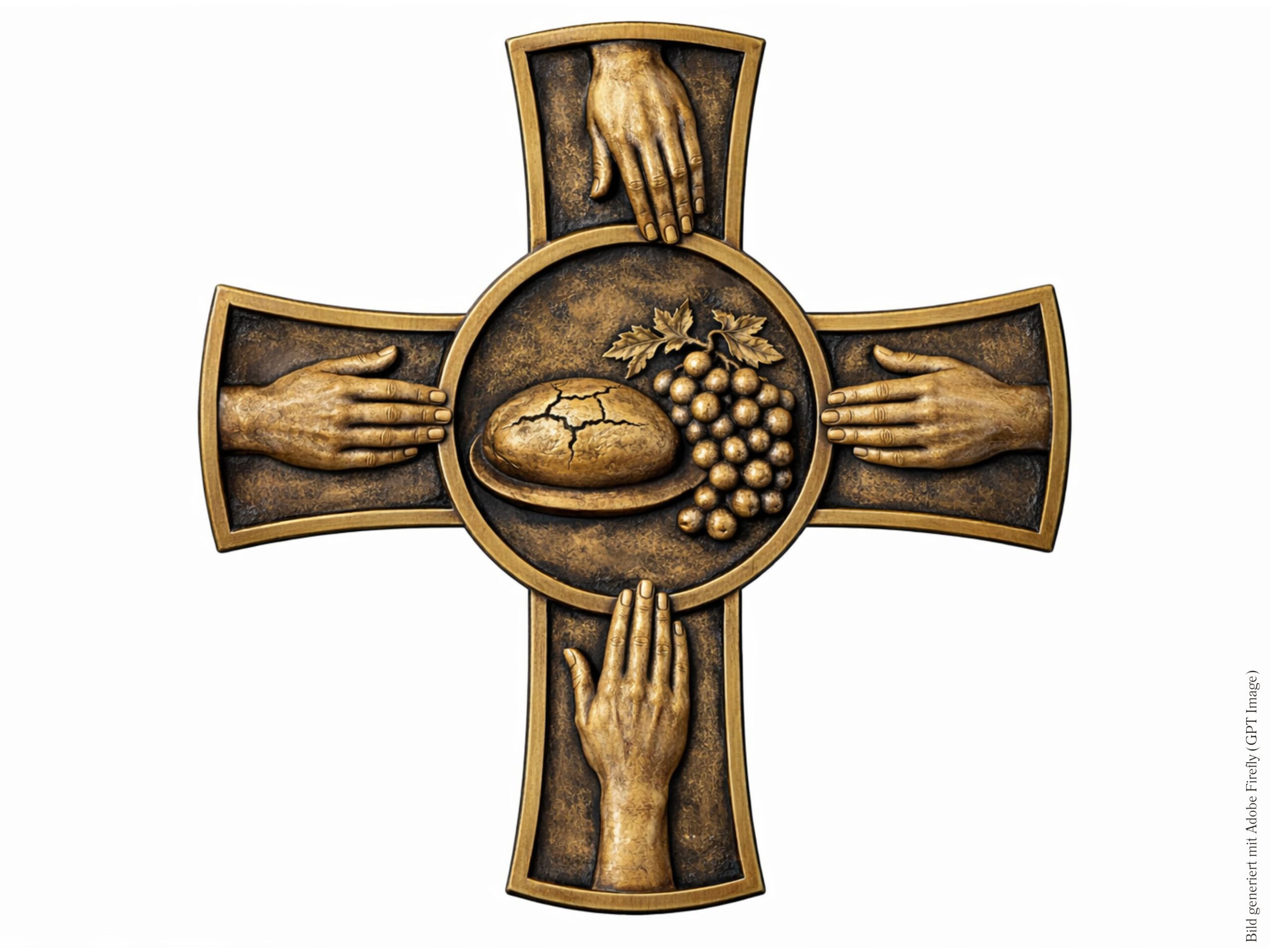 Wie früher schon einmal erwähnt, mache ich durchaus geistliche Entdeckungen bei meinem Zahnarzt. Dazu gehört auch das kleine Kreuz, das dort über der Eingangstür hängt. In der Mitte sind Brot und Weintrauben abgebildet. Und auf den vier »Armen« des Kreuzes sind dann jeweils Hände abgebildet, die sich zu Brot und Weintrauben ausstrecken.